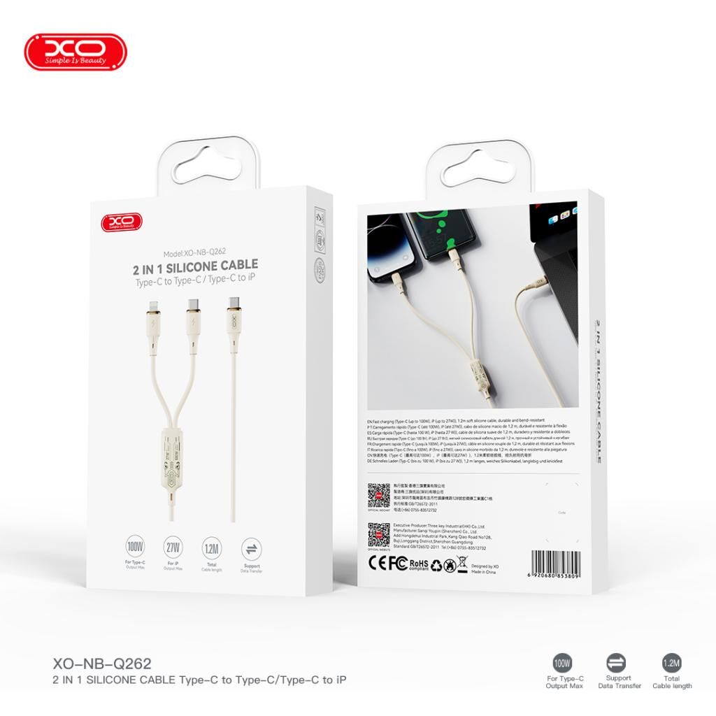 Cáp Sạc Nhanh 1 Ra 2 Type C To L (27W)+C (60W) XO Q262 1.2M