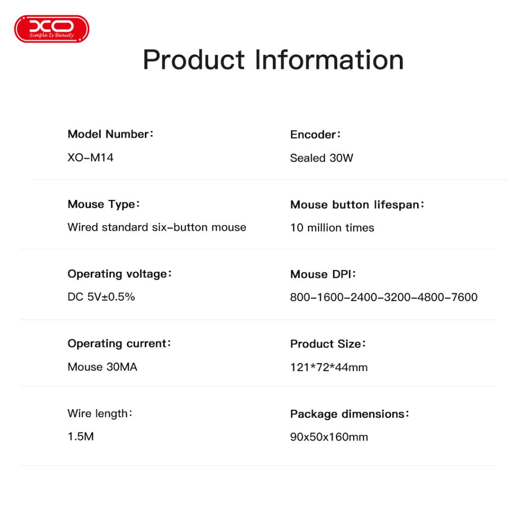 Chuột có dây XO-M14 là lựa chọn lý tưởng cho nhu cầu học tập, làm việc và giải trí hàng ngày. Với thiết kế hiện đại, trọng lượng nhẹ cùng hiệu năng ổn định, sản phẩm mang đến trải nghiệm sử dụng mượt mà và thoải mái trong thời gian dài.