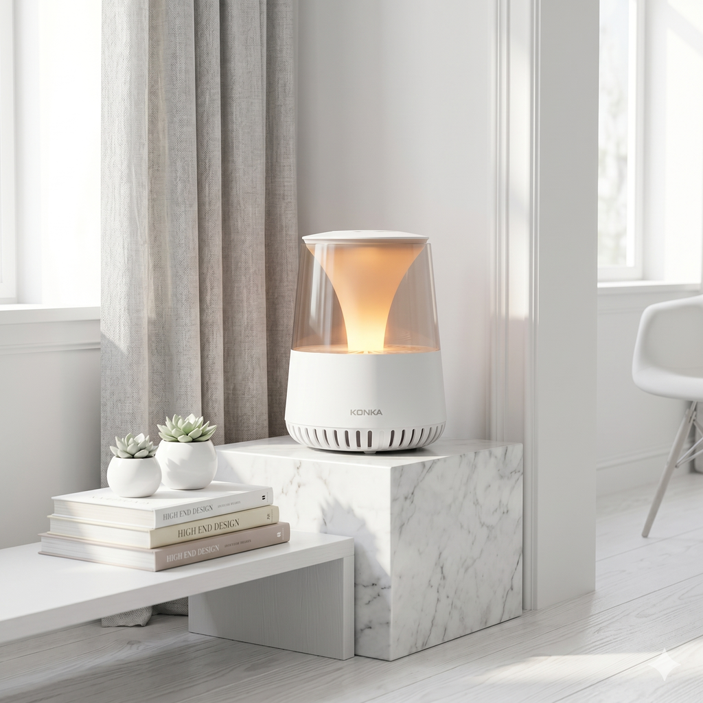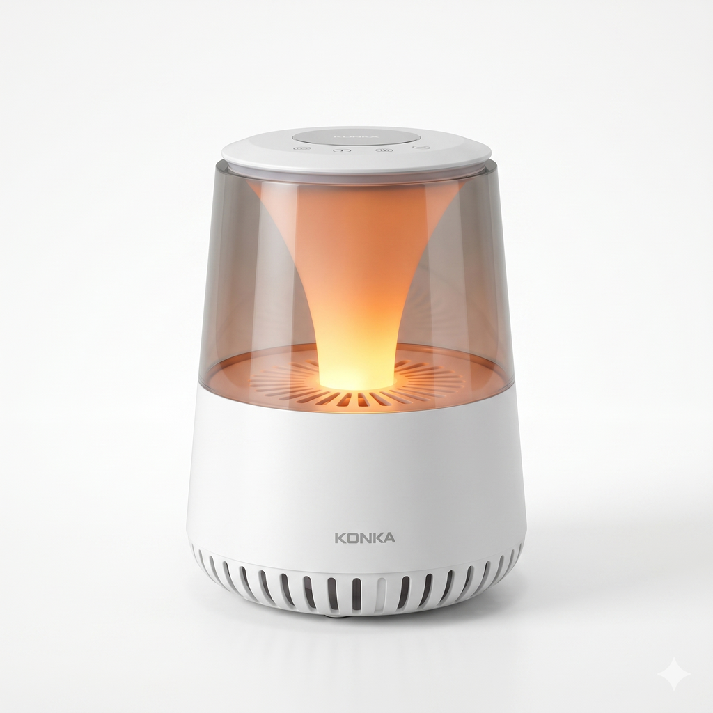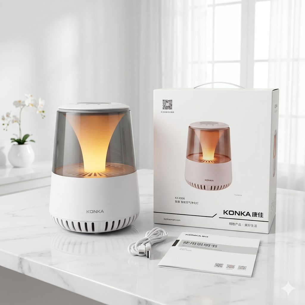 Đèn lọc không khí thông minh Konka sử dụng bộ lọc HEPA Cacbon + chức năng tạo ion âm nồng độ cao để khử trùng và thanh lọc không khí hoàn toàn.