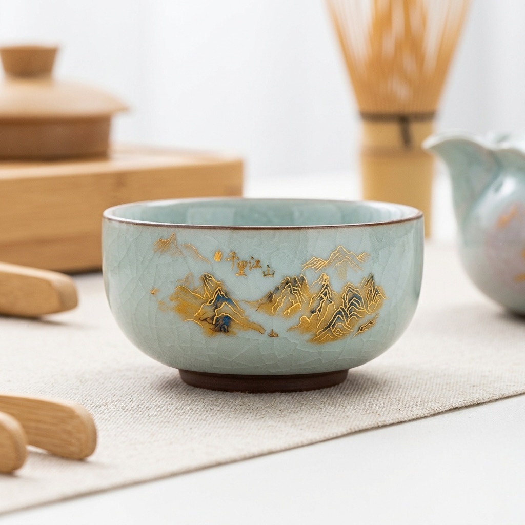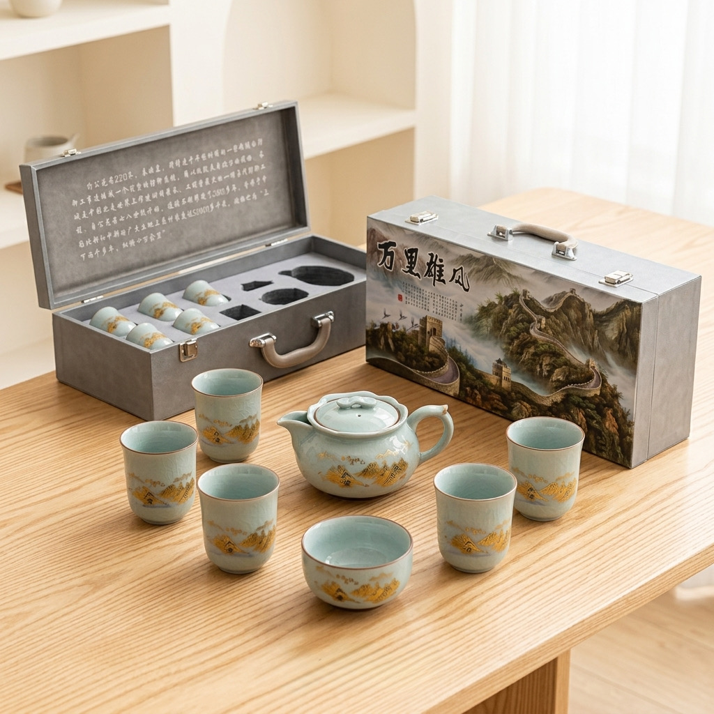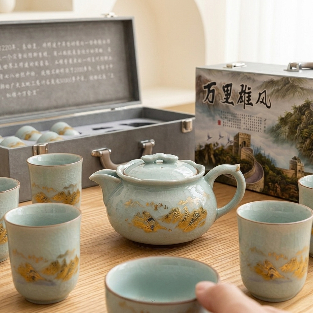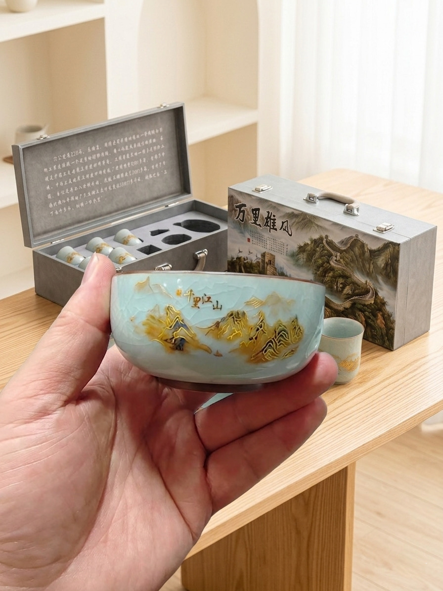 Bộ Ấm Chén Trà Gốm Men Rạn Cao Cấp - Họa Tiết "Giang Sơn Như Họa" - Hộp Quà Tặng Sang Trọng