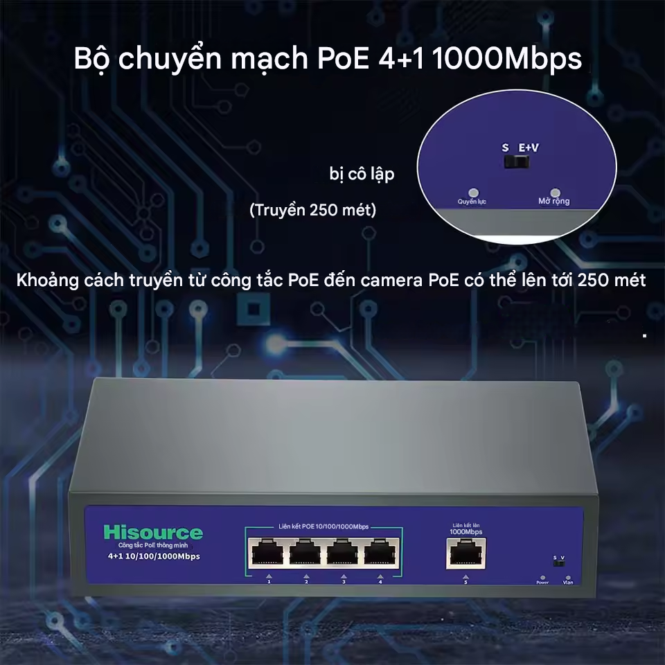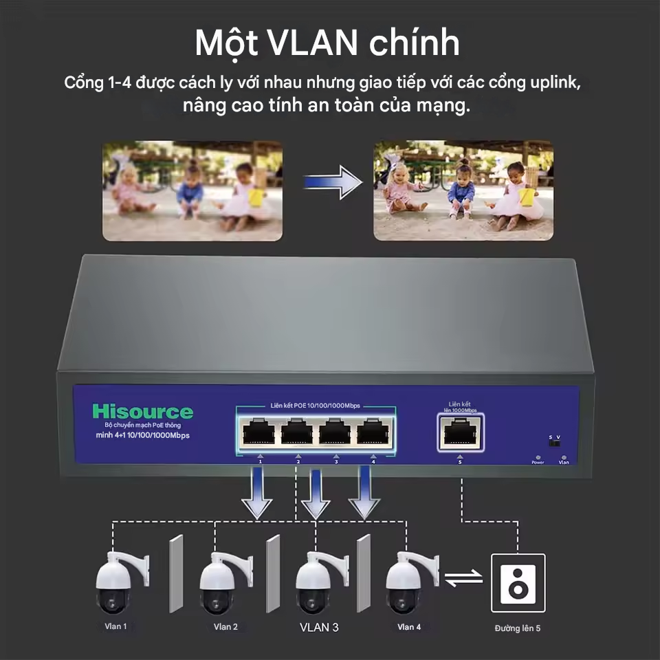 Switch PoE Gigabit 5 cổng: Gồm 4 cổng PoE (10/100/1000 Mbps) và 1 cổng uplink RJ‑45 gigabit