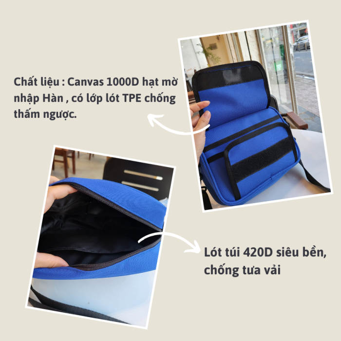 - Chất liệu : Canvas 1000D hạt mờ nhập Hàn , có lớp lót TPE chống thấm ngược.